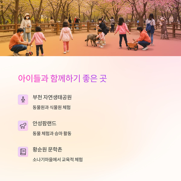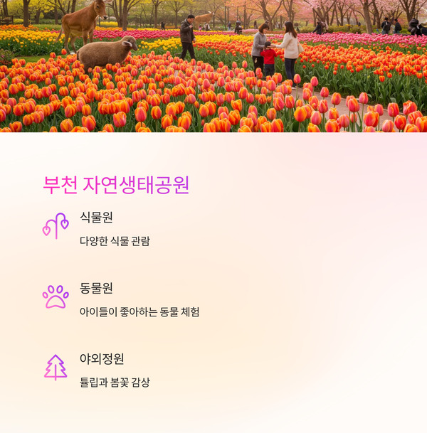 | 4 | 부천 자연생태공원 | 부천 | 튤립, 봄꽃 가득한 식물원과 동물원, 아이와 나들이에 적합 |