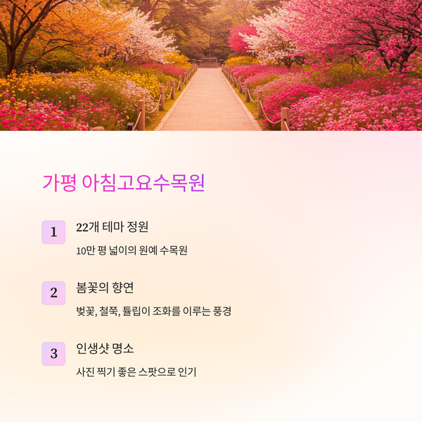 | 1 | 아침고요수목원 | 가평 | 10만 평 규모의 수목원, 벚꽃·튤립·철쭉 등 봄꽃 명소 |