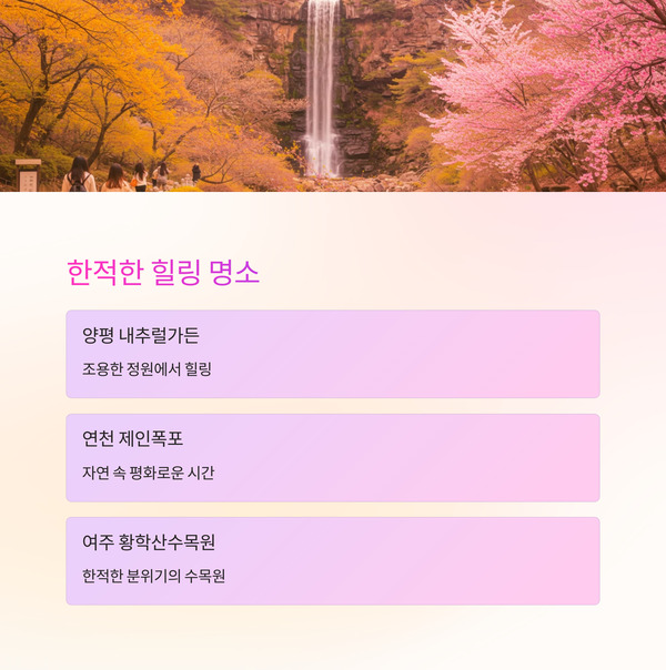 A. 양평 내추럴가든, 연천 제인폭포, 여주 황학산수목원 등 조용한 명소도 많아요.