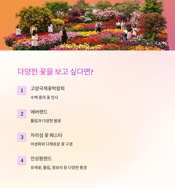 A. 고양국제꽃박람회, 에버랜드, 자라섬 꽃 페스타, 안성팜랜드 추천드려요.