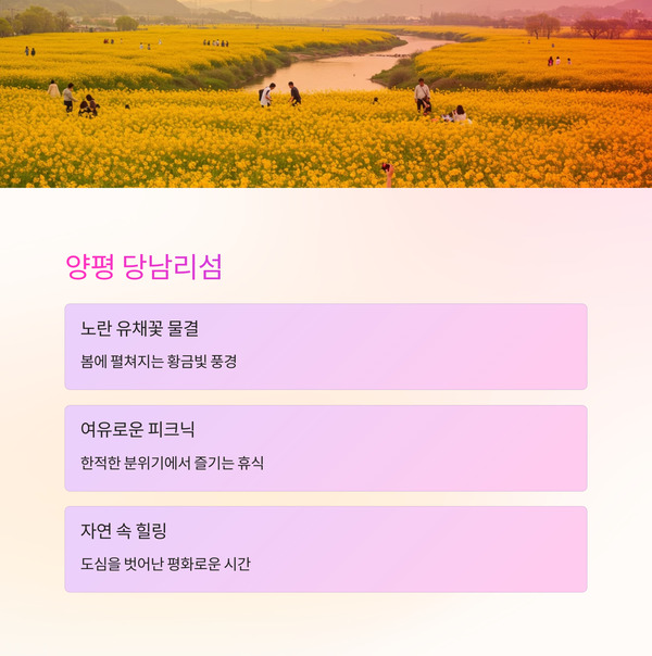 | 6 | 당남리섬 | 양평 | 유채꽃 명소, 피크닉 장소로 인기 |