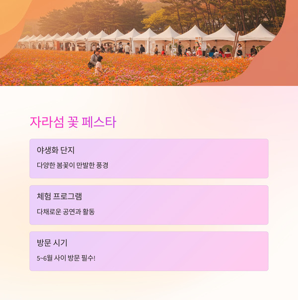 | 2 | 자라섬 꽃 페스타 | 가평 | 5~6월 야생화 단지, 포토존, 공연·체험 풍성 |