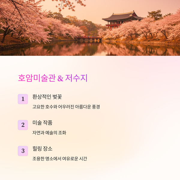 | 8 | 호암미술관 & 저수지 | 용인 | 벚꽃과 미술관의 조화, 호수 배경 사진 명소 |