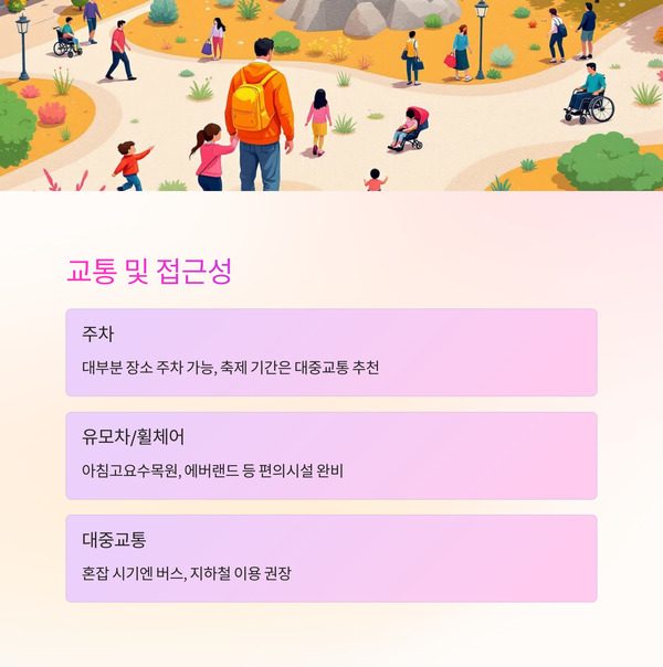 A. 대부분 장소는 주차 가능하지만, 축제 기간엔 대중교통 이용을 추천드립니다.