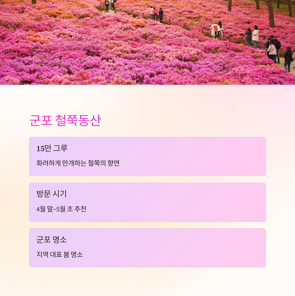 | 9 | 군포 철쭉동산 | 군포 | 15만 그루 철쭉, 4월말~5월초 철쭉축제 개최 |