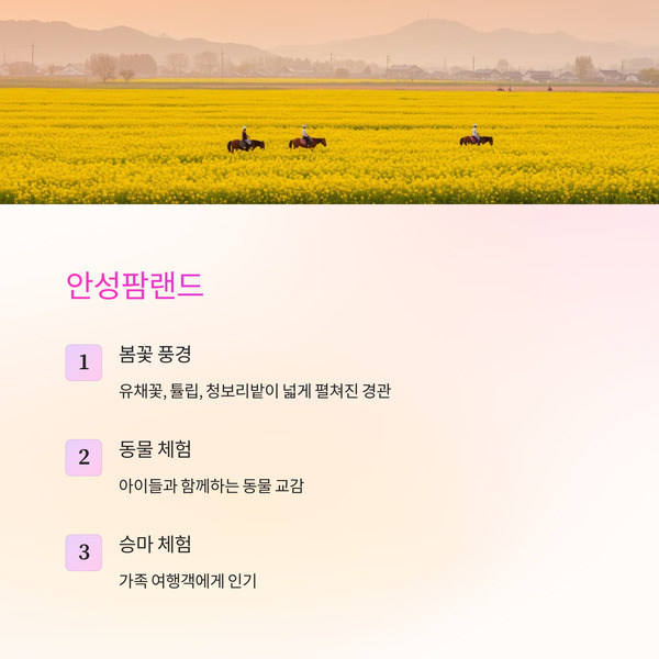 | 5 | 안성팜랜드 | 안성 | 유채꽃·튤립·청보리밭 풍경, 동물체험 가능 |