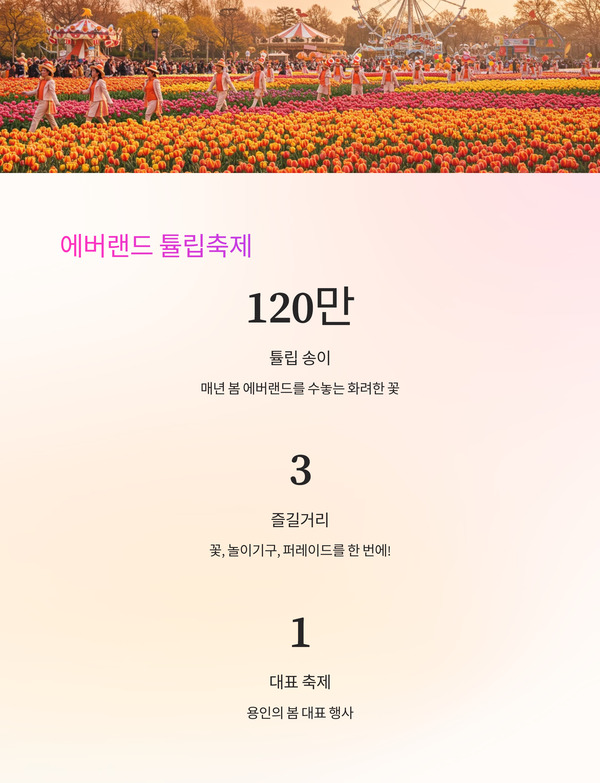 | 7 | 에버랜드 튤립축제 | 용인 | 120만 송이 튤립, 퍼레이드와 놀이시설까지 |