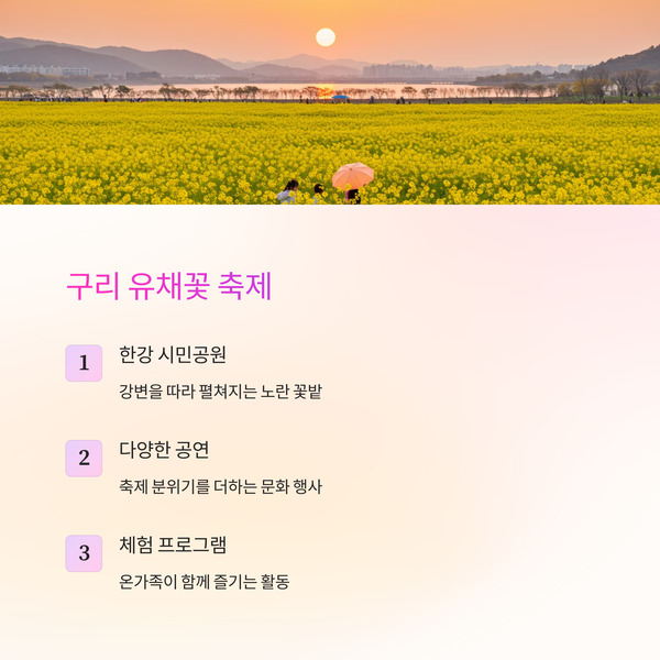 | 10 | 구리 유채꽃 축제 | 구리 | 한강변 유채꽃, 공연과 체험 프로그램 다수 |