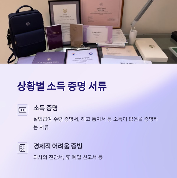 | 소득 증명 | 실업급여 수령 증명서, 해고 통지서 등 | 소득이 없음을 증명하는 서류 |
