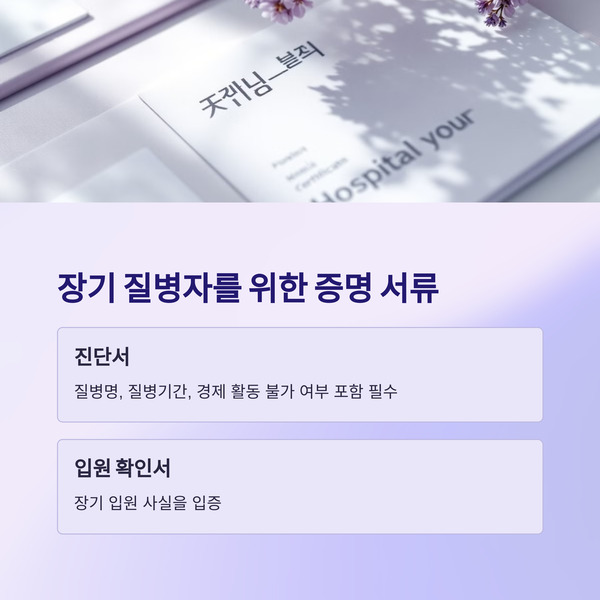 | 장기 질병자 | 진단서 | 질병명, 질병기간, 경제 활동 불가 여부 포함 필수 |