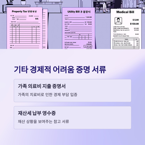 | 경제적 어려움 증빙 | 의사의 진단서, 휴·폐업 신고서 등 | 장기 질병, 사업 실패, 재해 등 경제적 어려움을 증명 |