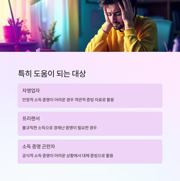 - 특히 자영업자, 프리랜서, 소득 증명이 어려운 분들에게 신뢰도 높은 증빙 수단이 될 수 있습니다.