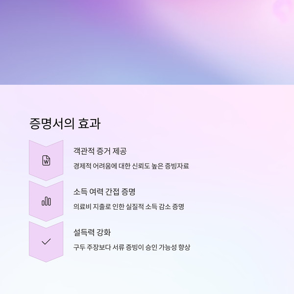 - 소득이 없거나 줄었다는 말을 서류 없이 주장하는 것보다, 의료비 지출 증명서로 간접적으로 소득 여력을 보여주는 방식이 훨씬 설득력 있습니다.