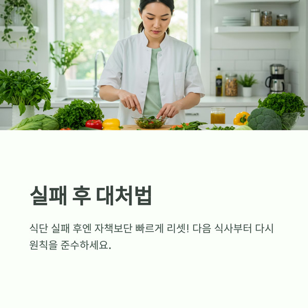 - 식단 실패 후엔 자책보단 빠르게 리셋! 다음 식사부터 다시 원칙 준수!