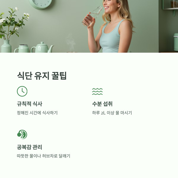 - 공복감이 심할 땐 따뜻한 물이나 허브차로 속을 달래보세요.