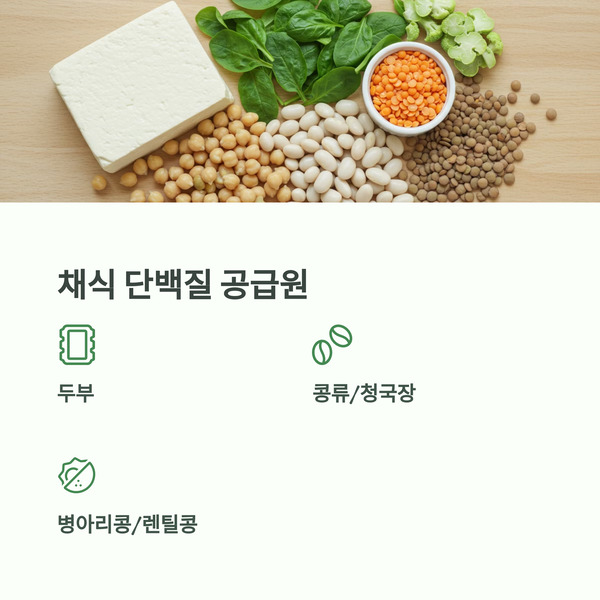 - 단백질은 두부, 콩류, 청국장, 병아리콩, 렌틸콩 등으로 보충