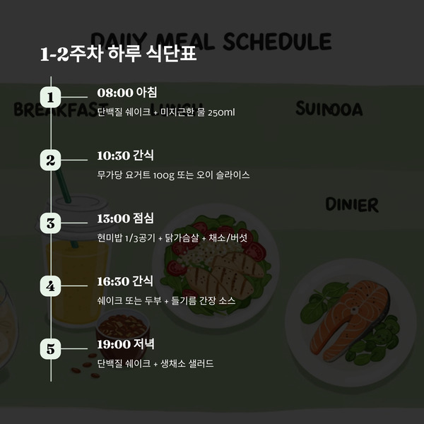 | 19:00 (저녁) | 단백질 쉐이크 1회 + 채소 | 단백질 쉐이크 + 상추, 오이, 청경채 등 생채소 샐러드 |
