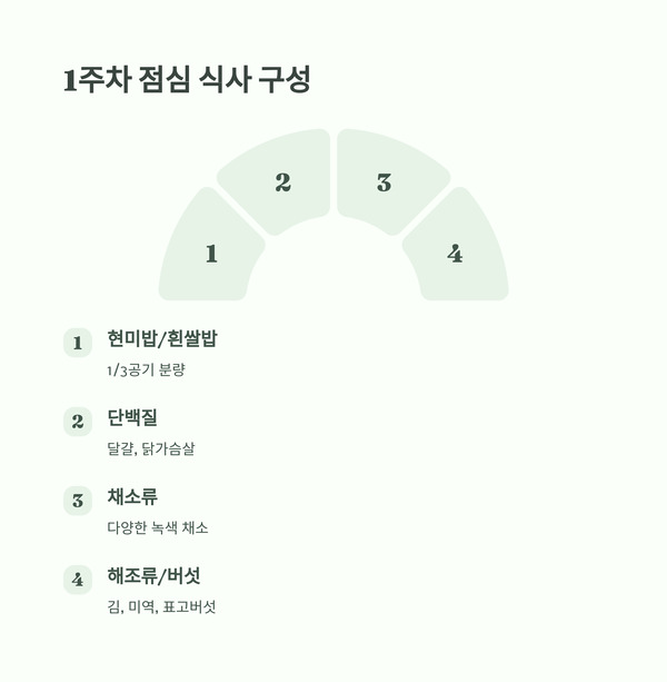 - 점심: 현미밥 또는 흰쌀밥 1/3공기 + 채소, 해조류, 버섯, 단백질(달걀, 닭가슴살 등)