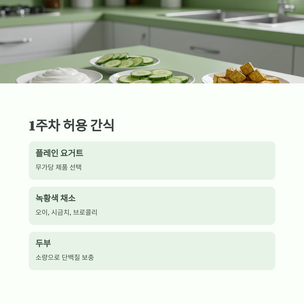 | 콩류 | 1주차에는 제한, 2주차부터 섭취 가능 |