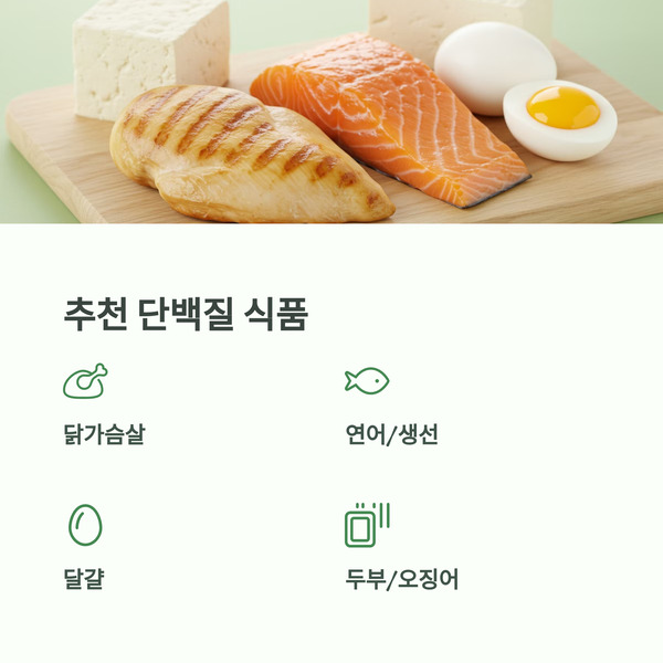| 단백질 | 닭가슴살, 연어, 달걀, 두부, 생선, 오징어 |
