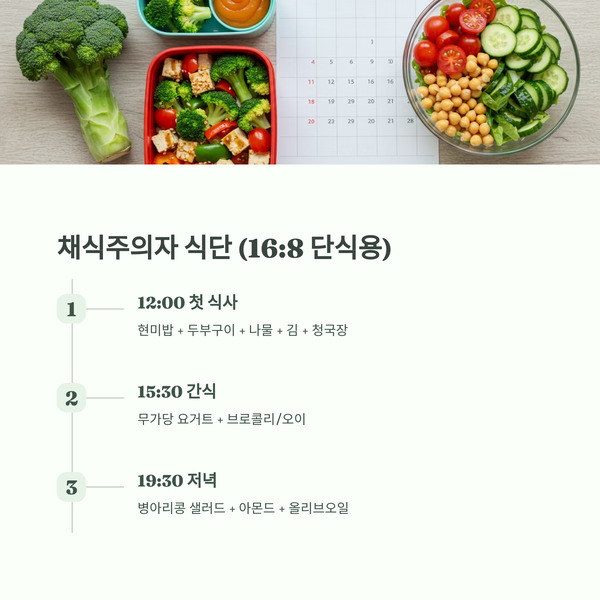 | 12:00 (첫 식사) | 채식 저탄수 고단백 식사 | 현미밥 1/3공기 + 두부구이 + 나물 2종 + 김 1장 + 청국장 국 |