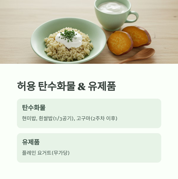 | 탄수화물 | 현미밥, 흰쌀밥 (1/3공기 이하), 고구마(2주차 이후) |