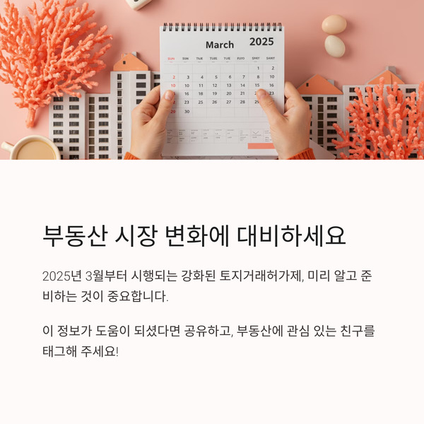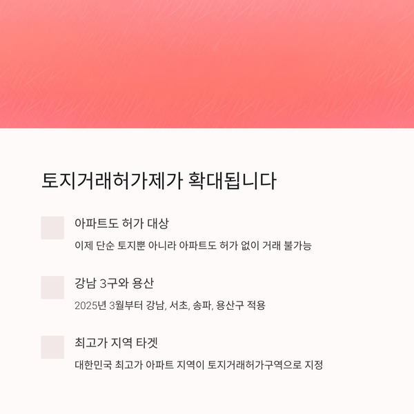 - 2025년 3월 24일부터 강남 3구, 용산 아파트 약 40만 가구가 토지거래허가 대상에 포함됩니다.