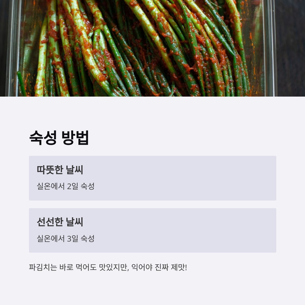 - 파김치는 바로 먹어도 맛있지만, 익어야 진짜 제맛!