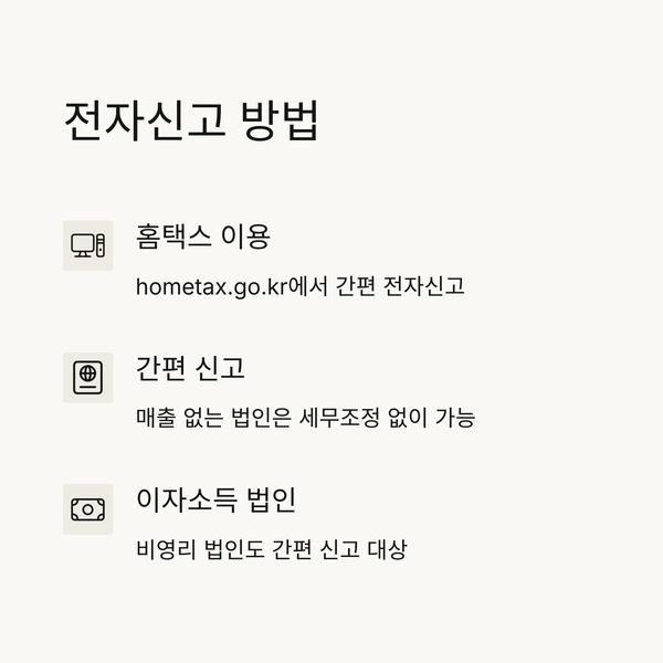 - 매출이 없거나 간편 법인은 세무조정 없이 신고 가능