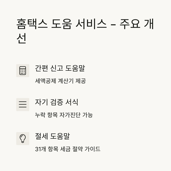 | 주요 개선 | 간편 신고 도움말 & 세액공제 계산기 |