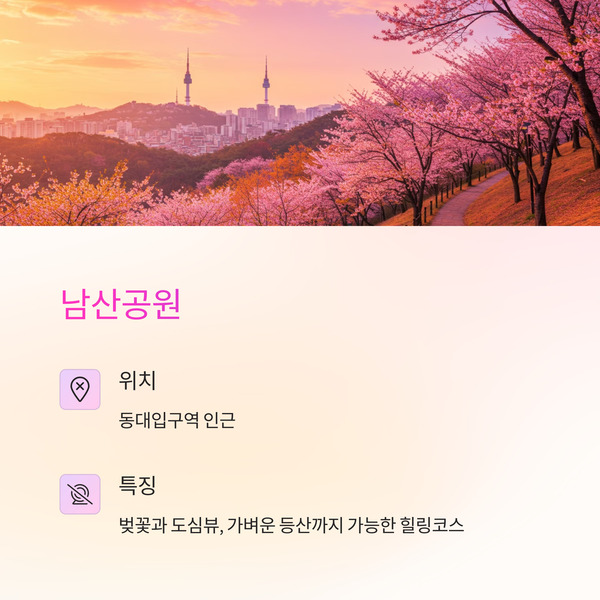 | 4 | 남산공원 | 동대입구역 인근, 벚꽃과 도심뷰, 가벼운 등산까지 가능한 힐링코스 |