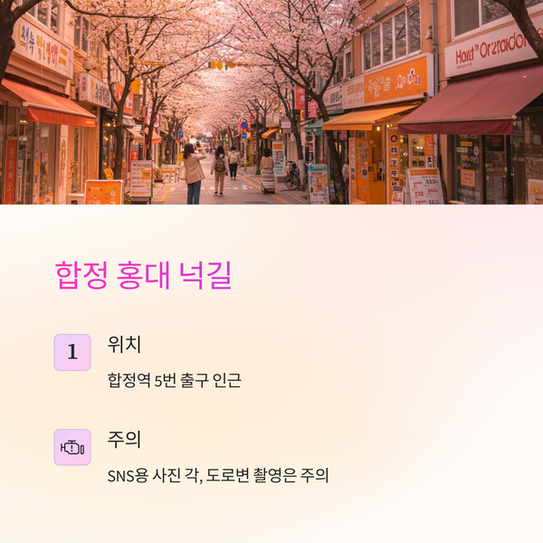 | 8 | 합정 홍대 넉길 | 합정역 5번 출구 인근, SNS용 사진 각. 도로변 촬영은 주의 |