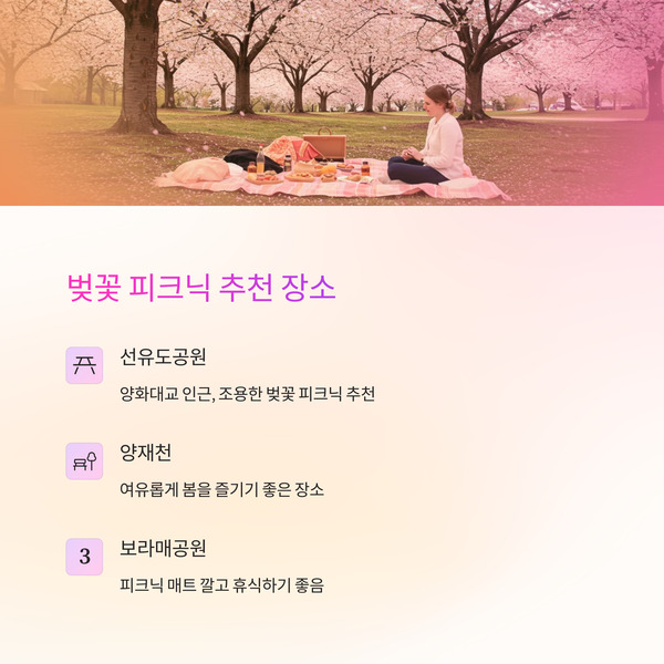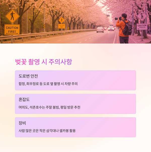 - 사람 많은 장소는 평일 추천: 여의도, 석촌호수 등은 주말엔 붐빔 주의!