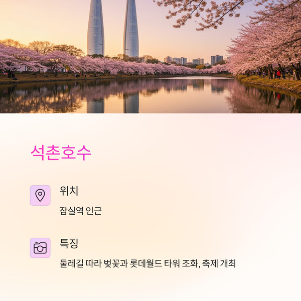 | 2 | 석촌호수 | 잠실역 인근, 둘레길 따라 벚꽃과 롯데월드 타워 조화. 축제도 함께 열려요 |