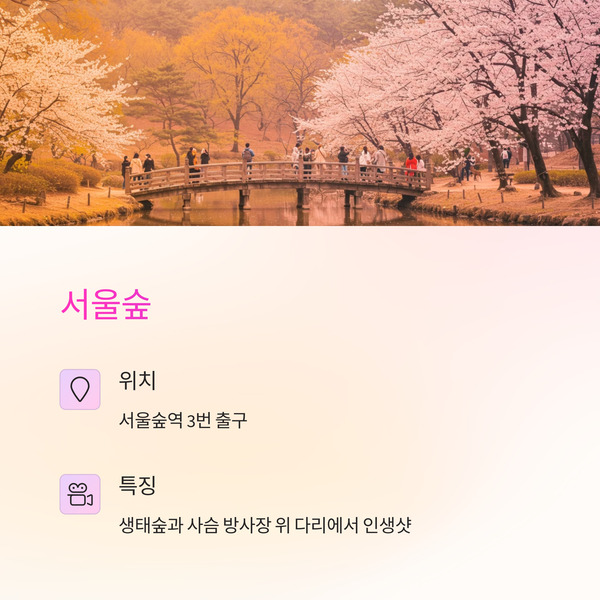 | 3 | 서울숲 | 서울숲역 3번 출구, 생태숲과 사슴 방사장 위 다리에서 인생샷 각 |