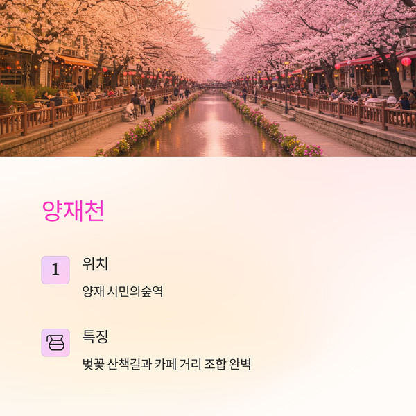 | 14 | 양재천 | 양재 시민의숲역, 벚꽃 산책길과 카페 거리 조합 완벽 |