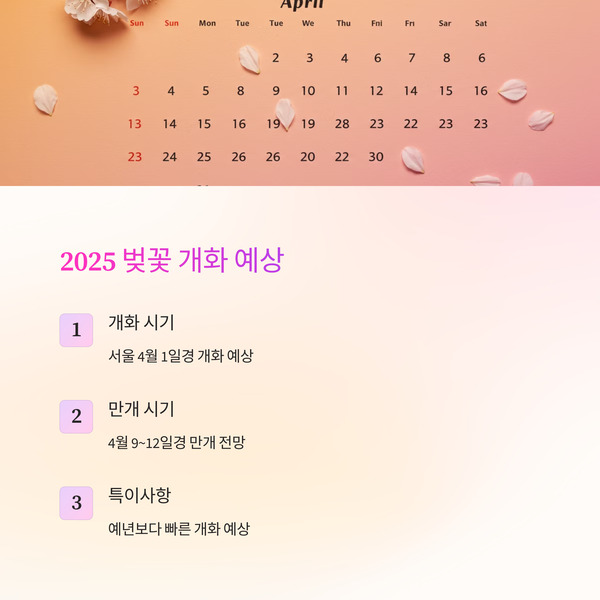 2025년에는 전국적으로 벚꽃 개화가 예년보다 빠를 것으로 예상되며, 서울도 4월 1일경 개화, 4월 9~12일경 만개가 될 전망입니다.