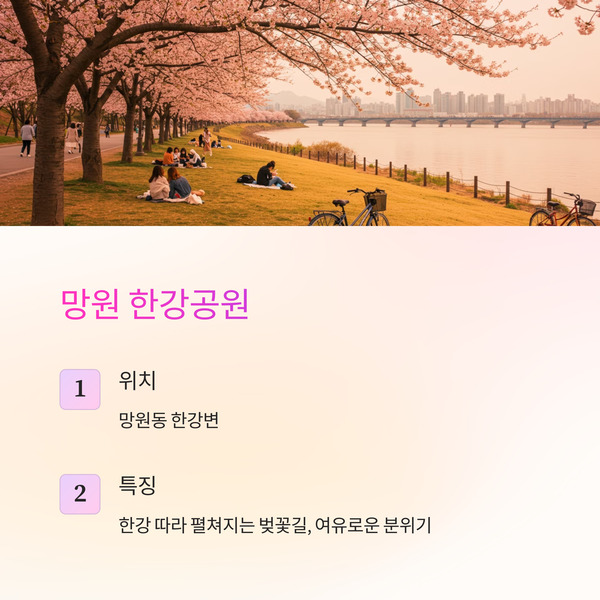 | 11 | 망원 한강공원 | 한강 따라 펼쳐지는 벚꽃길. 사진은 다소 평범하지만 여유로움은 최고 |