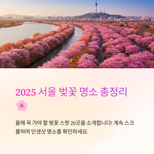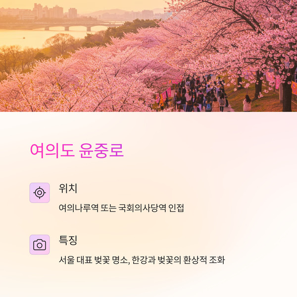 | 1 | 여의도 윤중로 | 서울 대표 벚꽃 명소. 한강과 벚꽃의 환상적 조화, 여의나루역 or 국회의사당역 인접 |