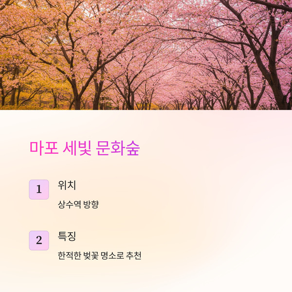 | 9 | 마포 세빛 문화숲 | 상수역 방향, 한적한 벚꽃 명소로 추천 |