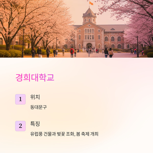 | 6 | 경희대학교 | 동대문구, 유럽풍 건물+벚꽃 조화. 봄 축제도 종종 열려요 |