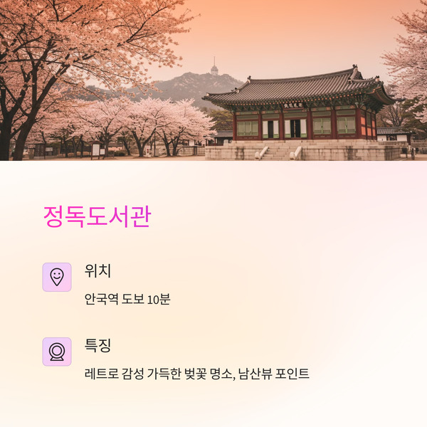 | 5 | 정독도서관 | 안국역 도보 10분, 레트로 감성 가득한 벚꽃 명소, 남산뷰도 포인트 |