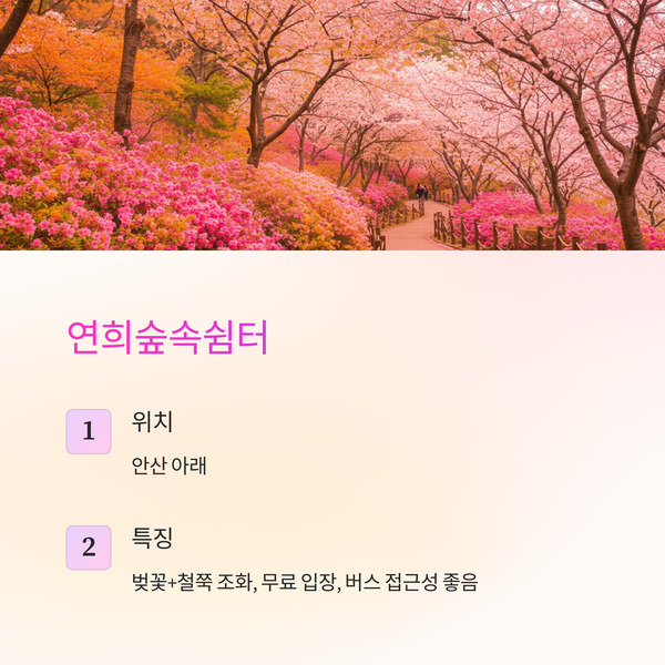 | 12 | 연희숲속쉼터 | 안산 아래, 벚꽃+철쭉 조화. 무료 입장, 대중교통은 버스가 편리 |