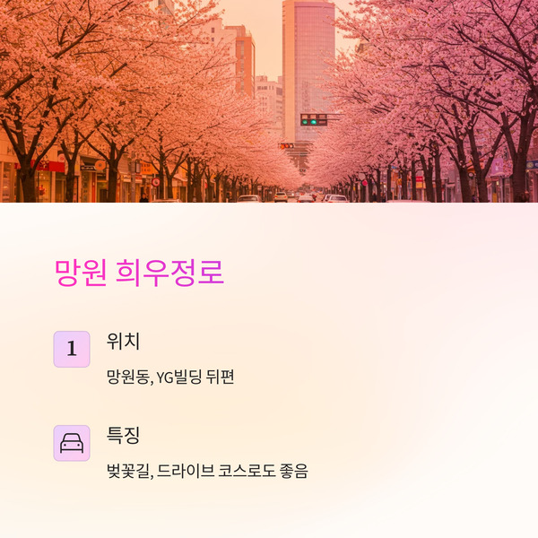 | 10 | 망원 희우정로 | 망원동, YG빌딩 뒤편 벚꽃길. 드라이브 코스로도 GOOD |