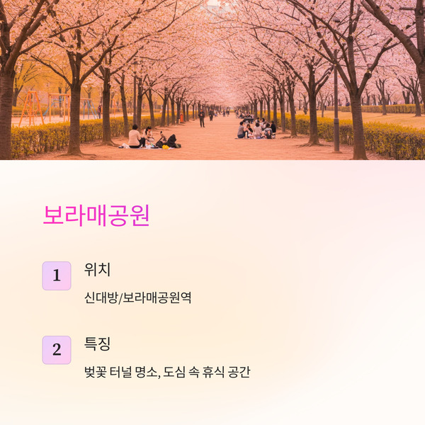 | 13 | 보라매공원 | 신대방/보라매공원역, 벚꽃 터널 명소. 도심 속 휴식 공간 |